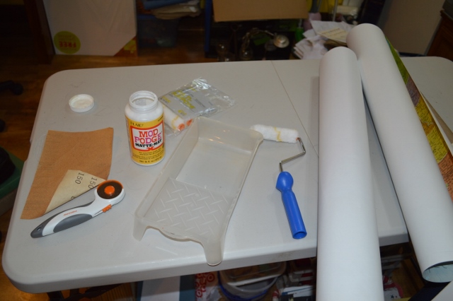 I have a large cutting mat (courtesy of a friend who no longer wanted it), a large straight edge (leaning against the kitchen wall studs in the midst of its remodel), and a rotary cutting tool (a little sewing and scrapbooking has earned me a few tools, too). I scoured my paint box in the garage for the small roller and roller cover (a new addition to the paint box last year when I painted the stairs), but a simple brush or sponge would’ve worked just as well. Finally, I pulled out the Mod Podge. I was all set.