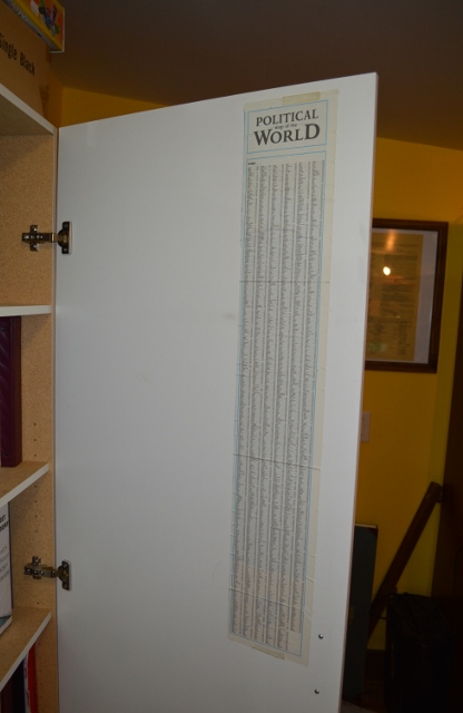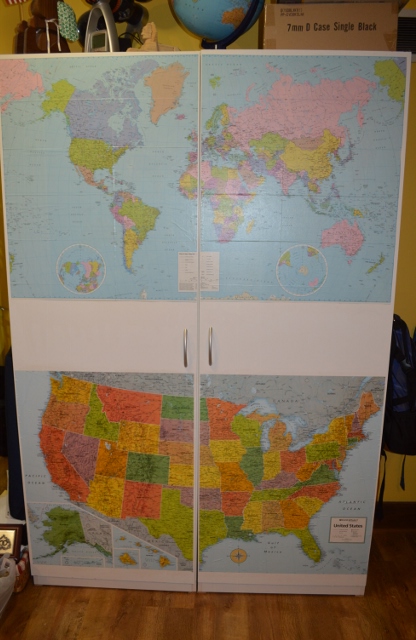 We have a large white cabinet against the wall that stores our curriculum. It’s a great cabinet. And it has a clean white front. It dawned on me one day – why not cut the maps and glue them to the doors? Wait! Cut the maps? What? Are you kidding me? Am I allowed to do that? AND glue them to the cabinet? This is crazy talk woman! As a rule follower and someone who doesn’t want to mess something up for someone else someday, these were rather radical ideas for me. But , after 40-something years, I’m also learning that it’s okay for me to claim my own things and make them my own – just like other people. So, once I gathered up the nerve, you guessed it – I cut and glued my maps on the cabinet!