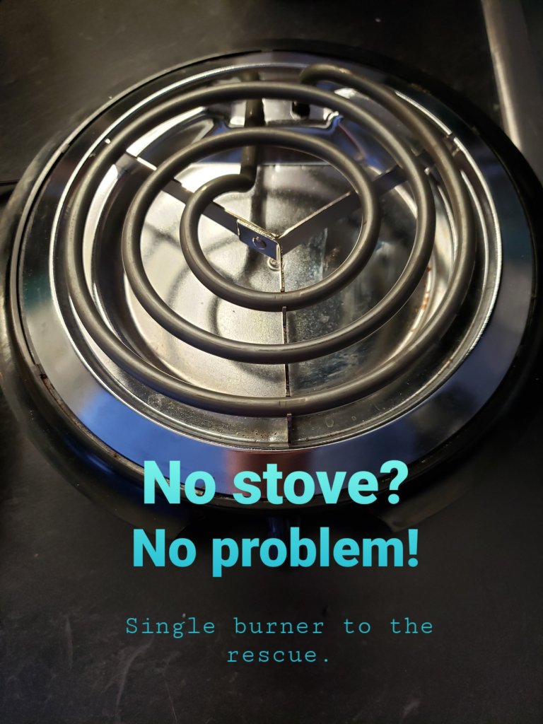 No stovetop? No problem. I’ve had this little single burner hotplate for so long, I can’t even recall from whence it came. No problem to pack it, a pan, and a spatula for my trip. Breakfast will be a snap.