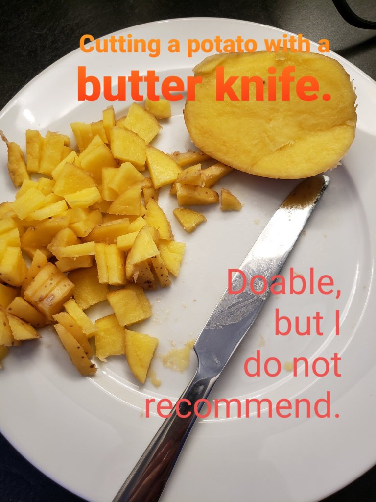 Now, would I recommend using a butter knife to cut and slice a potato? No. I would not. It is definently not the right tool for the job and it was certainly more difficult, but it DID get the job done.